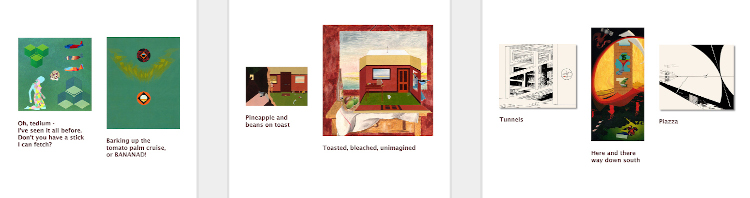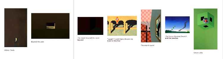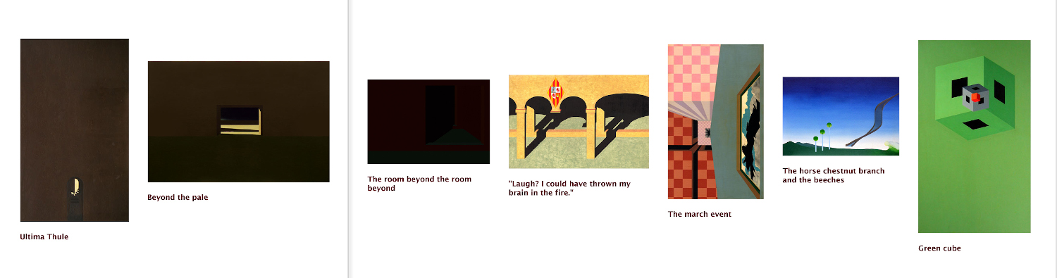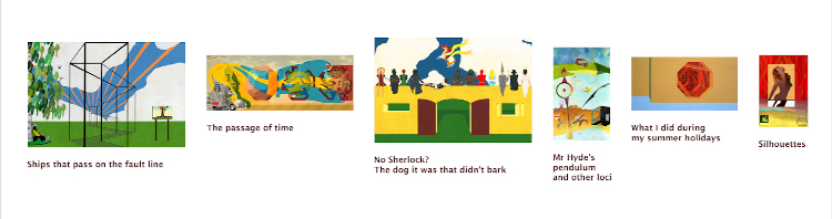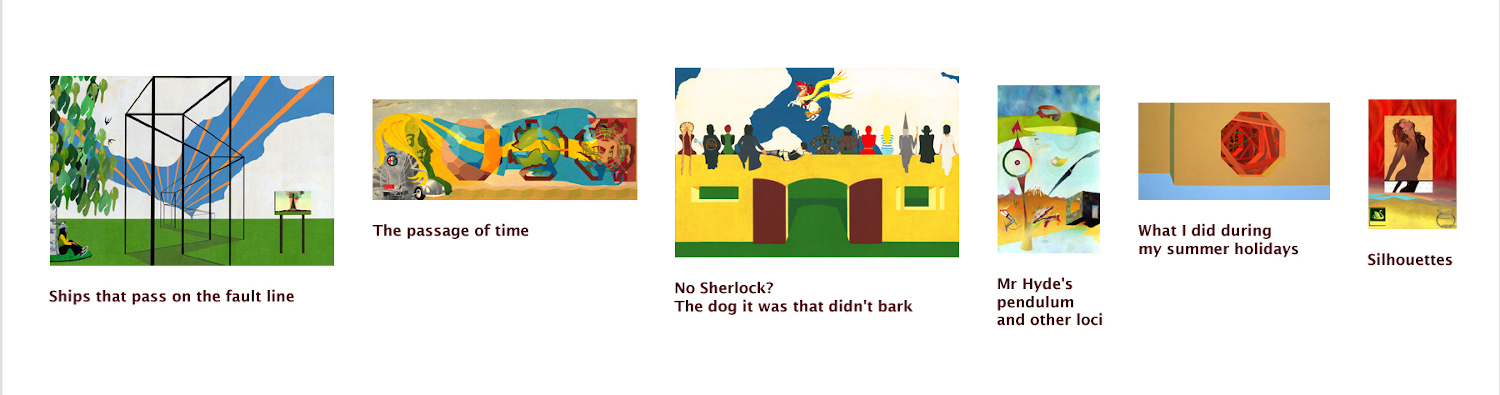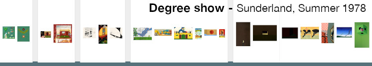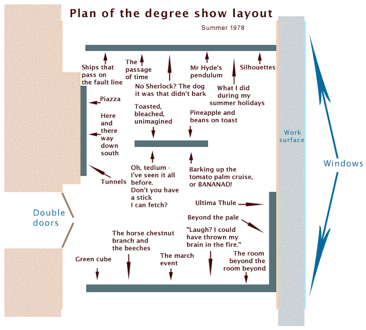 Early in the 1st year I had noticed a written instruction on a door to a group being taught by John Peace telling them to paint a picture using a specific set of pigments. The list of pigments were either high chroma or low chroma - I can't now remember, but I appended an alternative list ('or you can try using......'), either low to his high or high to his low. I little later he tracked me down and trembling with anger gave me a full throttle though low volume telling off. At that point I hadn't yet refereed a football match, even so I found it more comic than intimidatory. I behaved very well and resisted the temptation to laugh. I don't believe I apologised, but I did state that there had been no intention to cause offence, and that I wouldn't repeat the exercise. Some time, in the 2nd year I think, I attended one of his lectures at which he showed slides of a number of his paintings. I was struck by the impressive use of colour, particularly secondary and tertiary shades. I was also impressed by an intentionally self effacing self portrait painted while he was suffering the flu. We were both surprised when he was appointed my personal tutor for my final year. Again he sought me out, and clearly alluding to the incident from the 1st year asked if I wanted to request a different tutor. I told him it was all the same to me and if it wasn't a problem for him it wasn't a problem for me. During my time on the Fine Art course I learnt exactly four art-related things independent of my own efforts. Two of those came from a fellow student:- 1) the warp and weft should be parallel to the stretcher when canvas is being stretched (I think I would have worked that out for myself, but he helpfully volunteered the information when he saw me start the process) and some time later; 2) primed canvas should be gently sanded before use ('Oh, that explains the shredded brushes...'). The other two things I learnt came from John Peace. The first being that boiled linseed oil speeds up the drying time of oil paint. The other being a demonstration - specifically the manner of constructing an exhibition. Making a bigger 'picture', balancing the parts, using 'lesser' pictures to set off others. With the exhibition space ready and all the works to hand John suggested I should start laying out the works against the walls as I saw fit, using the works on my list. He would return later. On the first run through I produced a layout which used all the works on my list except 'Silhouettes', plus 'BANANAD!' and 'Oh, tedium' from John's list. I was reasonably happy with the layout except for one of the two long walls on which I had 'Ships that pass', 'Passage of time', 'No Sherlock?' and 'The horse chestnut'. When he returned John agreed with my observation that the wall didn't 'work', and objected to the inclusion of one or more of 'Ships that pass', 'Passage of time' and 'No Sherlock?'. I said all three had to be in, and with that specific layout. He accepted this, the three were left lined up against the wall. We moved on to other walls, where John separated the two drawings 'Tunnels' and 'Piazza' by the inclusion of 'Here and there' which was on neither list. Next John accepted my thematic linking of 'Ultima Thule', 'Beyond the pale', 'The room beyond', 'Laugh' and 'March event', but reorganised the sequence. He then removed 'Horse chestnut' from the first wall and placed it between 'March event' and 'Green cube' Returning to the first wall I was less than convinced when John took 'Summer holidays' from his list and the unlisted 'Mr Hyde's pendulum' as well as the sidelined 'Silhouettes' and brought them across. However their addition transformed the hitherto 'iffy' wall. The two works on John's initial list which didn't get displayed are shown below.