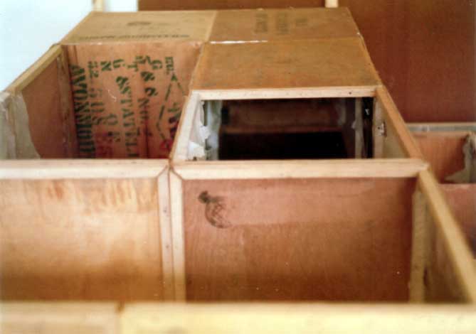 Maze B File 1 and bottom of file 2. The darker hole in the centre is the exit from the entry tunnel into 'Grand Central Station'. 1975 Tea chests and timber.