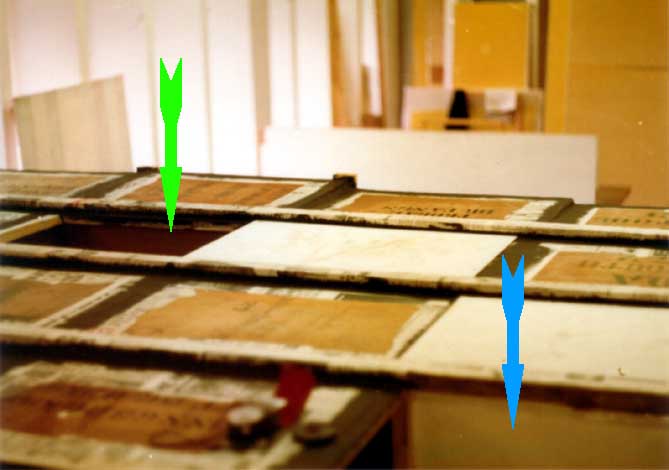 Maze Q Top of completed maze. Green arrow shows the emergency exit (above 'Grand Central Station'), blue arrow shows the exit proper. 1975 Tea chests and timber.