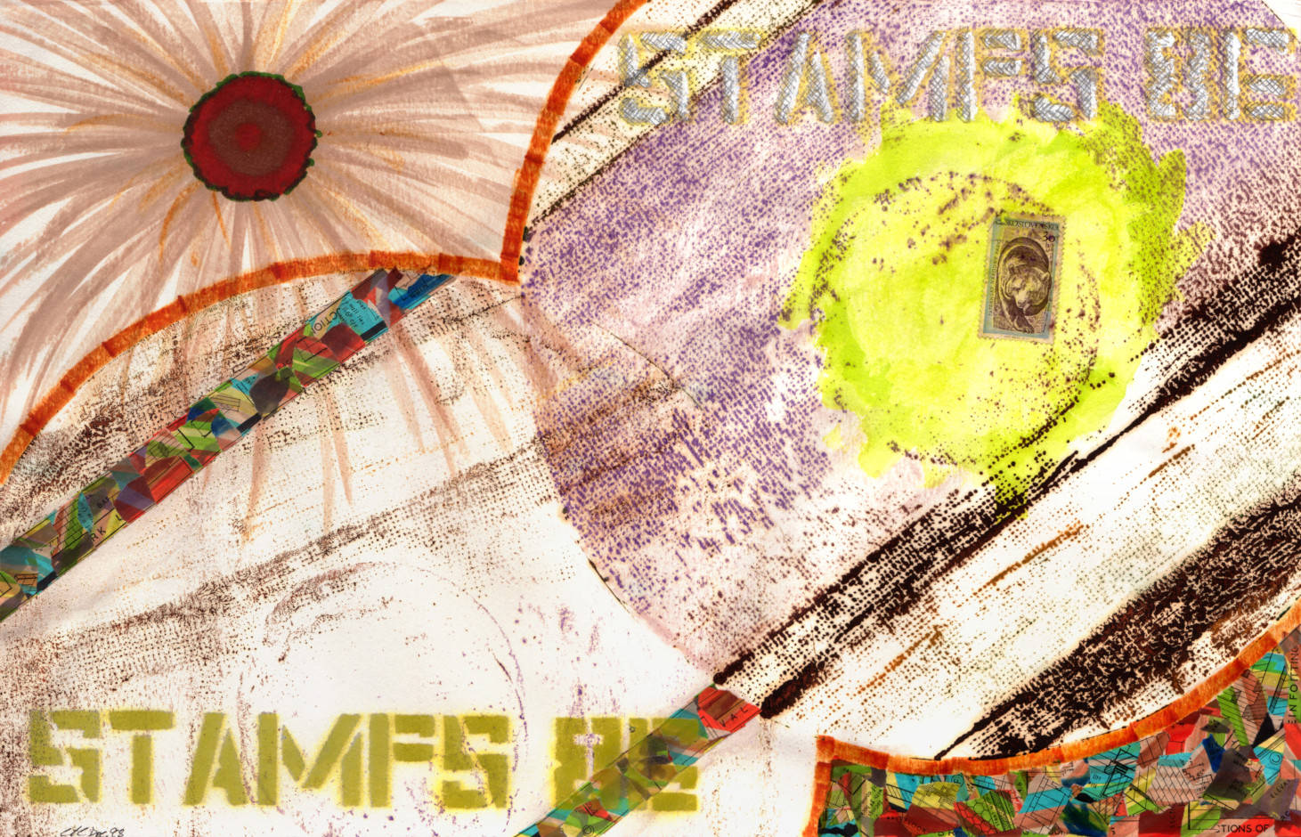 NPS-17 (Stamps 86, untitled) Dec 98 Collage, oils, marker, car spray paint, pencil on blotting paper 45cm (18") x 29cm (11")