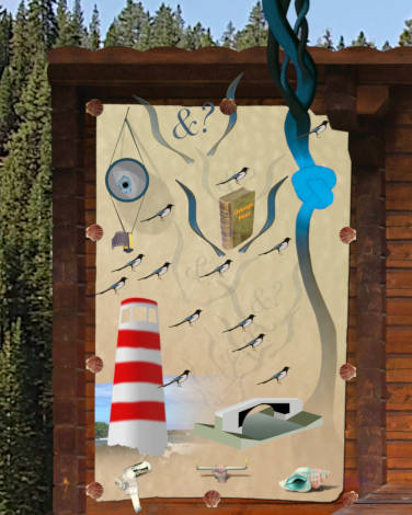 A note re magpies For as long as I can remember I have known the saying which indicates that seeing a single magpie is the harbinger of bad luck on the way, while seeing a pair of magpies indicates good luck in the offing - 'One for sadness, two for joy'. For almost as long I have known that the rhyme exists in a longer form, and with regional variations. This knowledge dates back to the days of the television series 'Magpie'. Although I never saw the programme I heard the song many times - One for sorrow, Two for joy, Three for a girl, Four for a boy, Five for silver, Six for gold, Seven for a secret never to be told. I remember reading or hearing of a version that went beyond seven, and wherein all the even numbers were connected with good luck/positives, and all the uneven numbers were connected with bad luck/negatives. None of any of this has a connection with the image above. When planning and making the image above the idea of a good luck / bad luck connection with the magpies never entered my mind - concentration and tunnel vision while elaborating a complicated work! Two months after finishing the image I am driving when a single magpie flies across the road 50 metres or so ahead of me. Later, looking at the image, the thought occurs 'Will people looking at the image imagine a connection with the rhyme?'. First idea - check if there are versions of the rhyme which go up to thirteen. There are - one '13' alludes to a creature of ill comportment, another '13' states 'beware the Devil himself', although the Devil is quite common, also appearing variously as '7', '9' (twice), '18' and '5' amongst the rhymes I found. However another '13' alludes to a good luck knowledge of magic. In consequence of now knowing that magpie rhymes go up to 13 it behoves me to state that the 13 magpies in the image above have no connection with magpie rhymes. They represent in fact thirteen points on a map. Similarly the 13 rubber ducks on P454V2iii 'The Albatross Equation - What was the question again?' represent 13 points on another map. |
