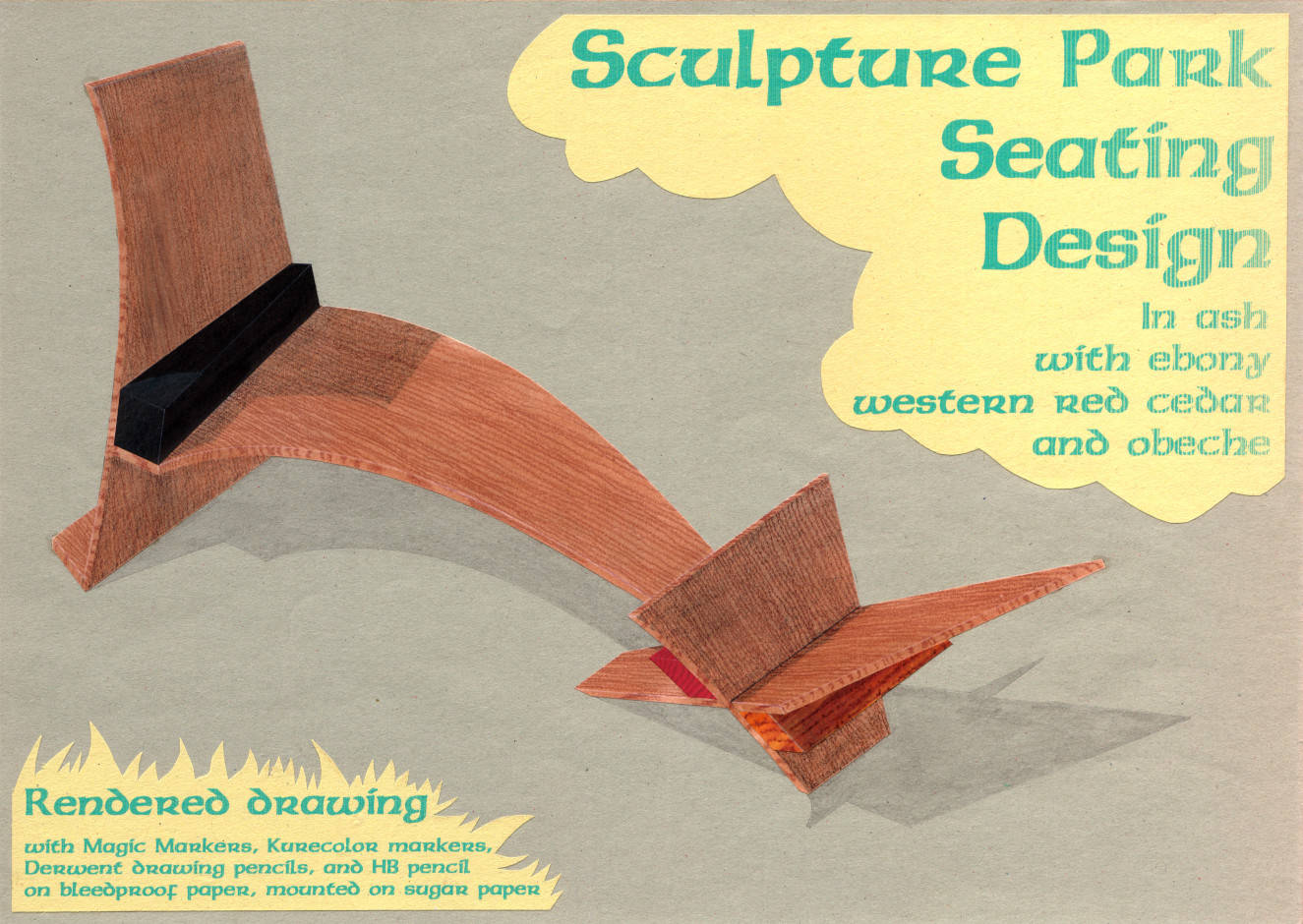 SP2 Sculpture Park seating design - ash, ebony, western red cedar and obeche 1995 Markers and pencil on paper 42cm (16.5") x 30cm (12")